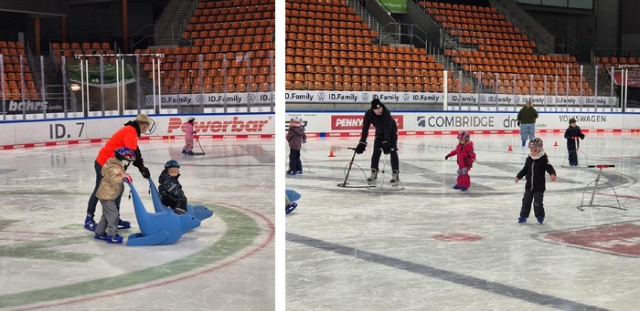 Ein besonderes Highlight war das Ausprobieren von Hockeyschlägern und Pucks. Mit großer Begeisterung testeten die Kinder ihr Geschick, schoben die Pucks über's Eis und fühlten sich dabei fast wie richtige Eishockeyspieler. Dabei standen Teamgeist, Ausprobieren und Freude an der Bewegung im Vordergrund.
